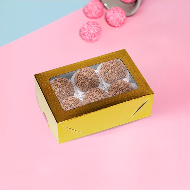 CAIXA LAMINADA COM VISOR PARA 06 DOCES DOURADA