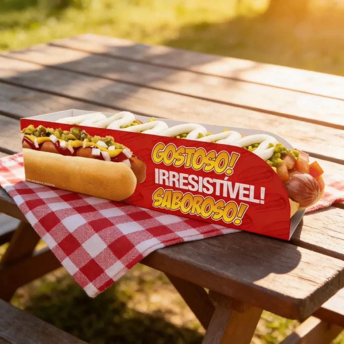 ESTE PRODUTO POSSUI ESTAMPA DE CACHORRO QUENTE E AS DESCRIÇÕES: \"GOSTOSO, IRRESISTÍVEL E SABOROSO\".