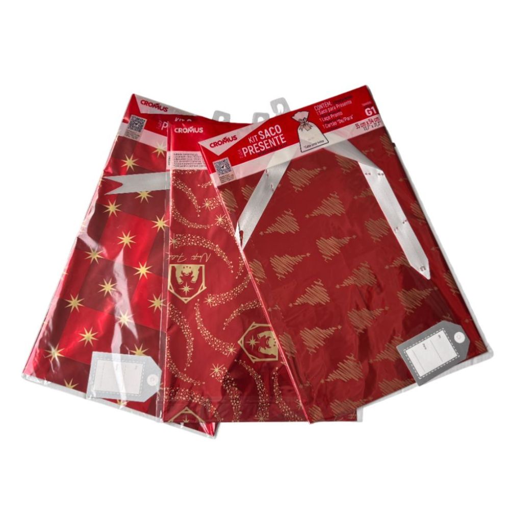 QUANTIDADE NO PACOTE: 1 SACO DECORADO, 1 LAÇO FÁCIL PARA FECHAMENTO E 1 CARTÃO \"DE/PARA\".